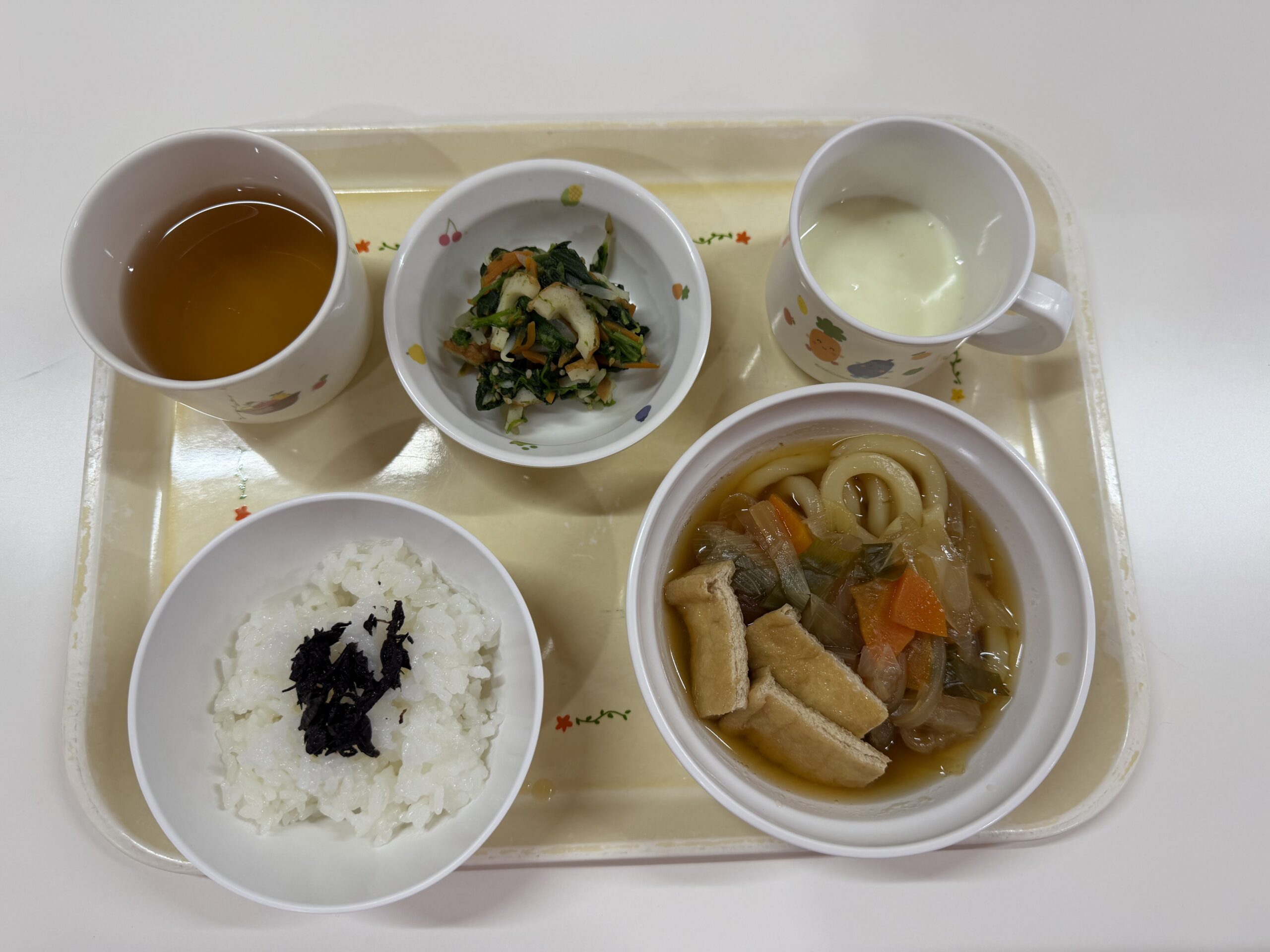 ご飯(ふりかけひじき)・年越しきつねうどん・ほうれん草とちくわのナムル・ヨーグルト -