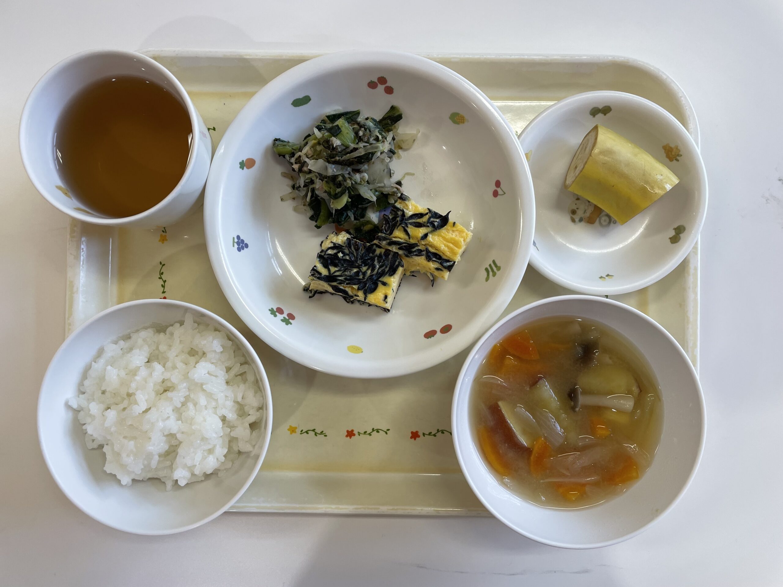 ご飯・ひじきの卵焼き・野菜の磯香和え・さつまいもと玉ねぎのみそ汁・バナナ
