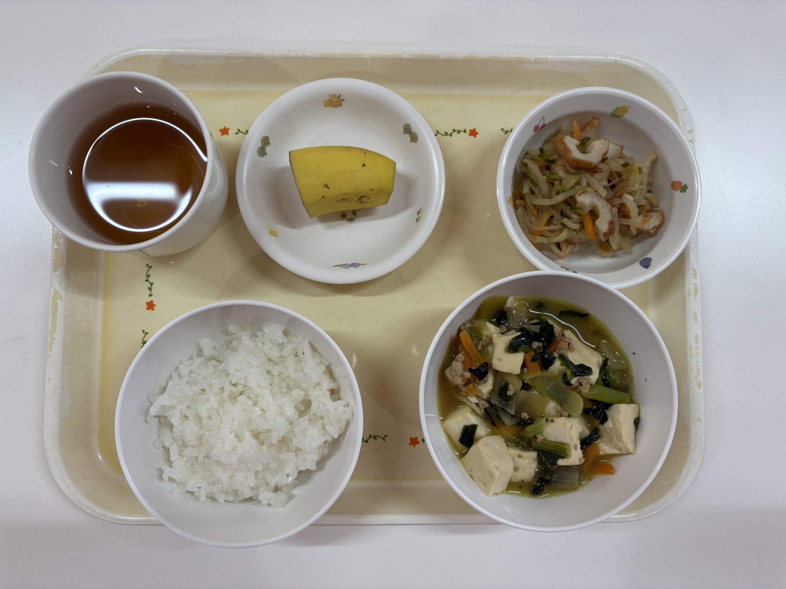 ご飯、豆腐の野菜そぼろ煮、切り干し大根のサラダ、バナナ