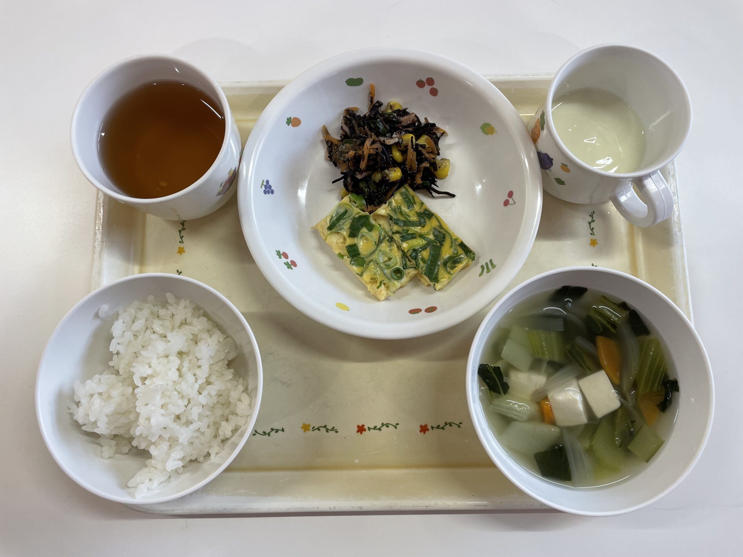 ご飯・ねぎの卵焼き・ひじきの中華和え・豆腐とチンゲンサイのスープ・ヨーグルト