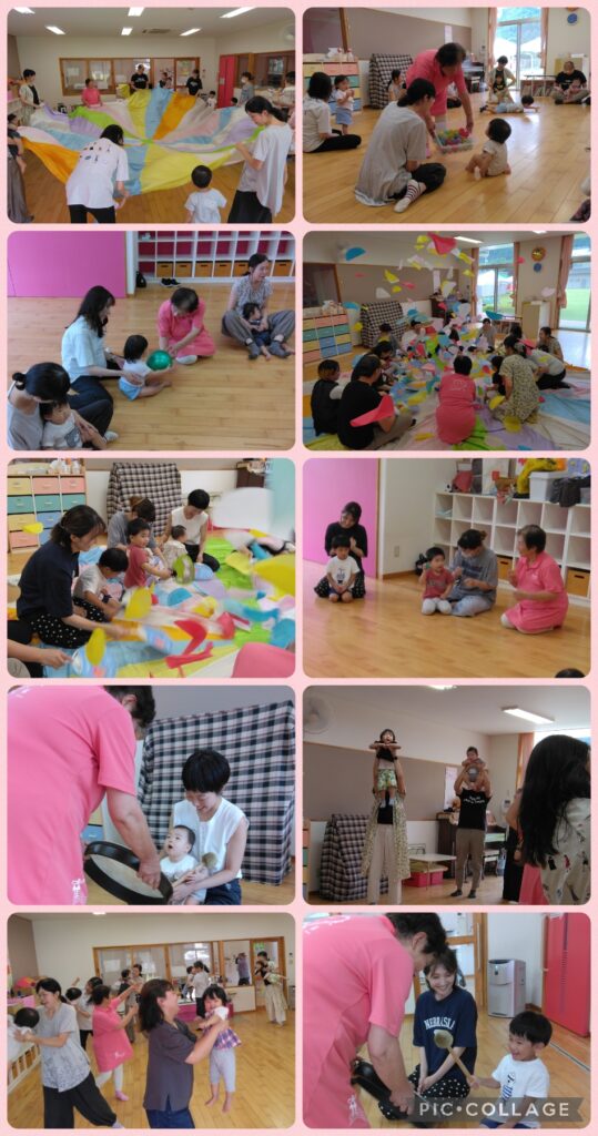 16日(火)は、『ミュージック・ケア』でした😊講師の依藤洋子先生に来ていただき、音楽に合わせていろいろな遊びを楽しみました。曲に合わせてパラバルーンを揺らしたり、うちわでお花紙をあおぐと、お部屋の天井までヒラヒラと飛び、子どもも大人も驚きと感動のキラキラした笑顔になっていましたよ✨