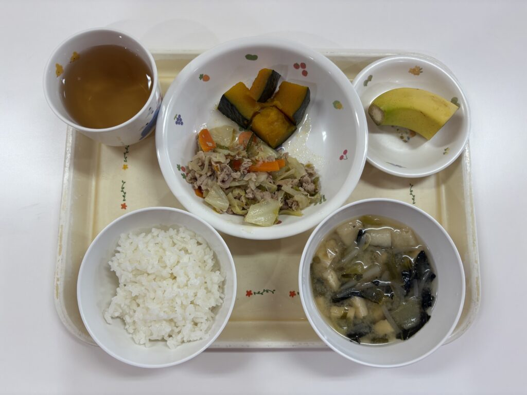 ご飯・豚肉の野菜炒め•かぼちゃの煮つけ•ふとチンゲン菜のみそ汁•バナナ