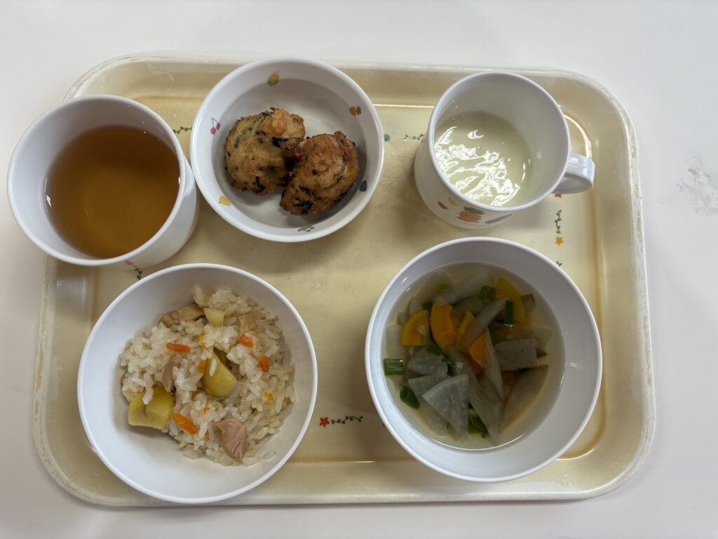 栗と鶏肉のおこわ・まさご揚げ・五目汁・ヨーグルト