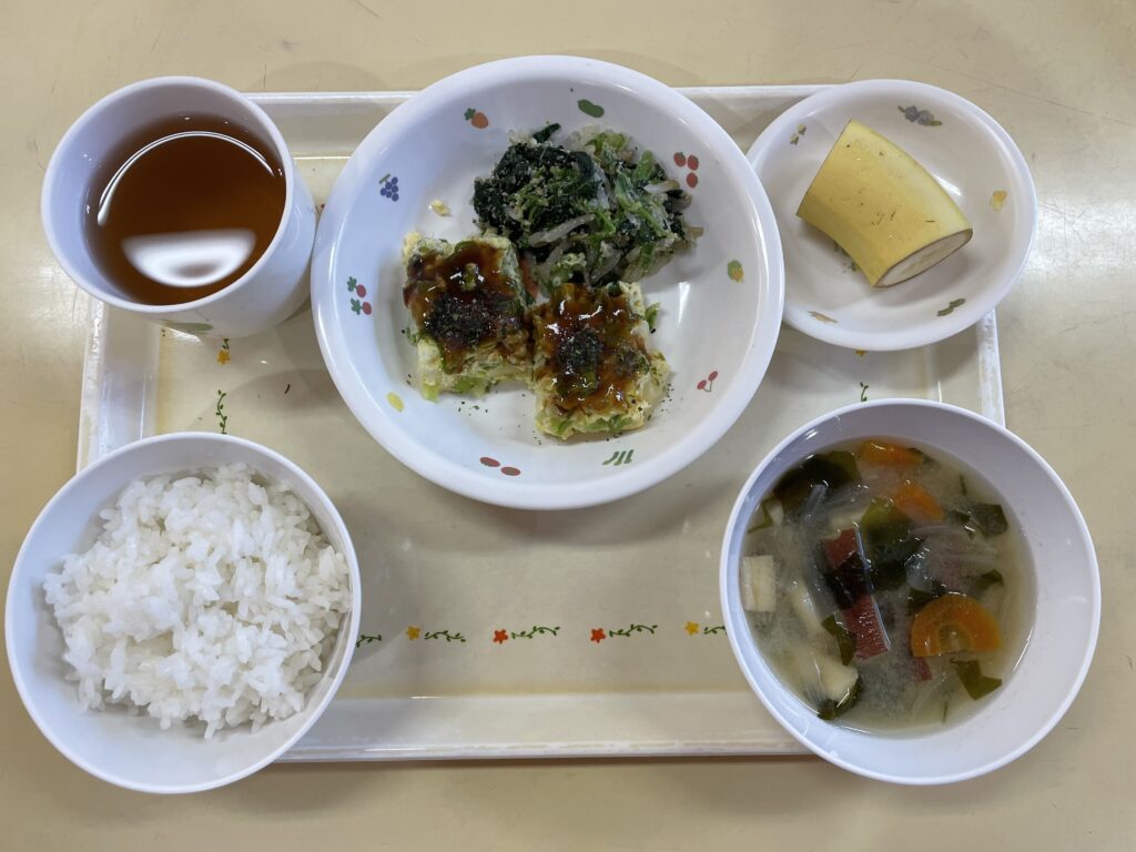 ご飯・お好み焼き風卵焼き・ほうれん草の塩ごま和え・さつま芋と玉ねぎのみそ汁・バナナ