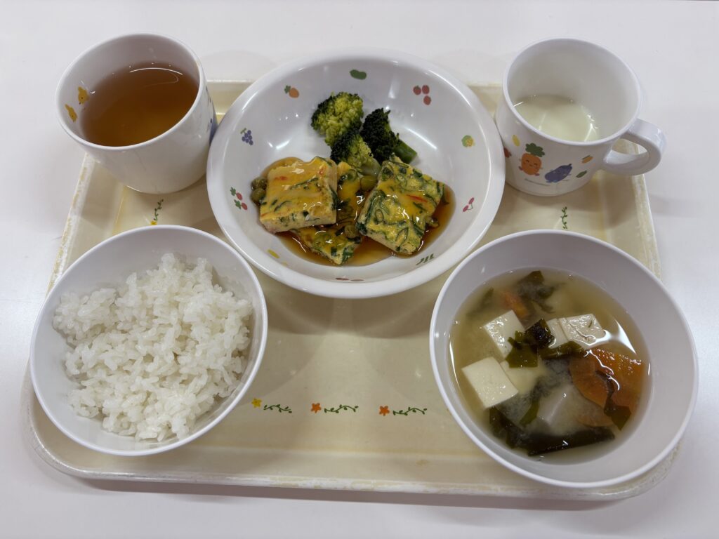 ご飯•かに玉•ゆでブロッコリー•豆腐と里芋のみそ汁•ヨーグルト