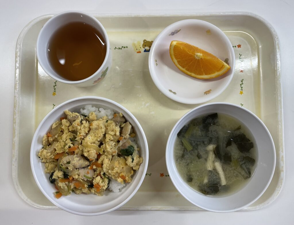 親子丼・小松菜と油揚げのみそ汁・オレンジ