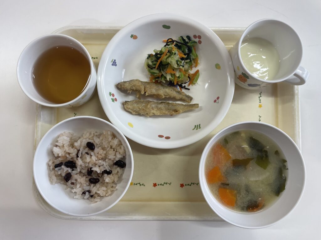 ご飯・わかさぎのごま揚げ・野菜の昆布あえ・じゃが芋と大根のみそ汁・ヨーグルト