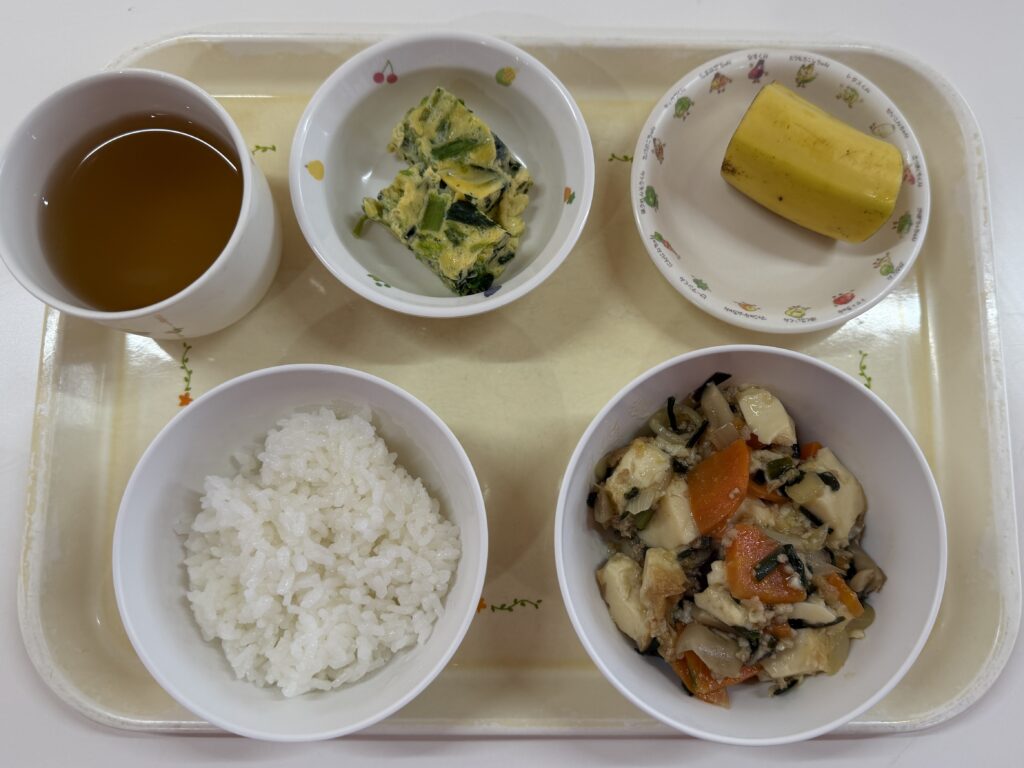 ご飯・厚揚げの炒め物・ほうれん草の卵焼き・バナナ