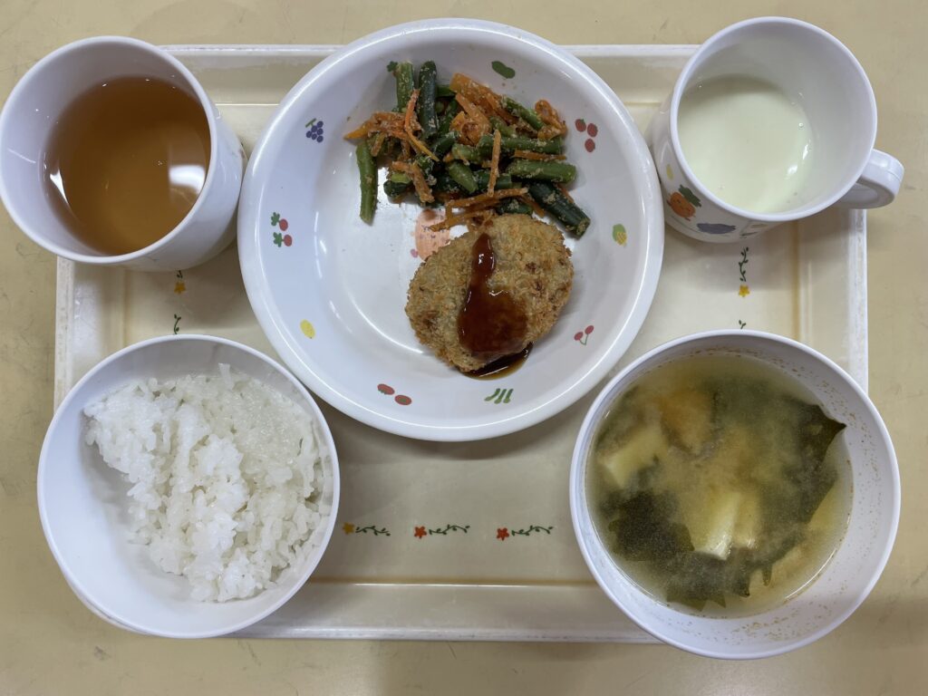 ご飯・コロッケ・いんげんと人参のごま和え・厚揚げとかぼちゃのみそ汁・ヨーグルト