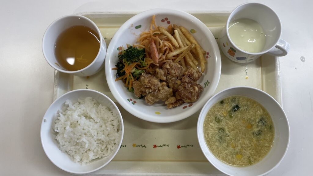 ご飯・鶏の唐揚げ・ナポリタン・フライドポテト・ブロッコリーと人参のおかか和え・中華卵コーンスープ・ヨーグルト